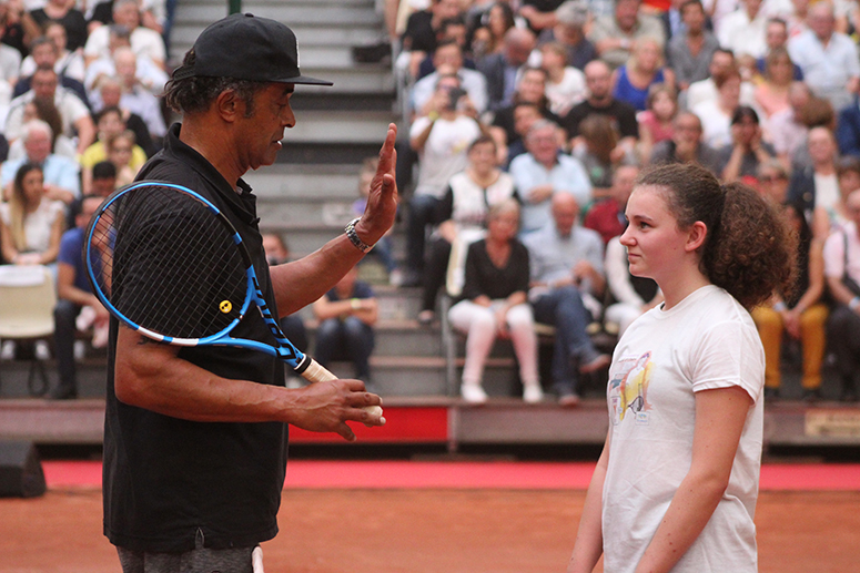 En effet, durant un long moment, Yannick Noah, équipé d’un micro, a fait quelques échanges avec des jeunes qui tour à tour se sont présentés devant lui. Parmi ces chanceux du jour, Leonard (12 ans) a donné du fil à retordre au champion qui a serré le jeu dans un grand éclat de rires. « J’ai commencé le tennis à 4 ans. J’étais au Club de Guesnain où je jouais 1H30 par semaine. Ici, j’ai trois entraînements par semaine, soit 6 heures, plus une heure de physique. Au début, j’étais stressé au moment de faire des balles avec Yannick Noah, et finalement c’était drôle», explique le champion en herbe.