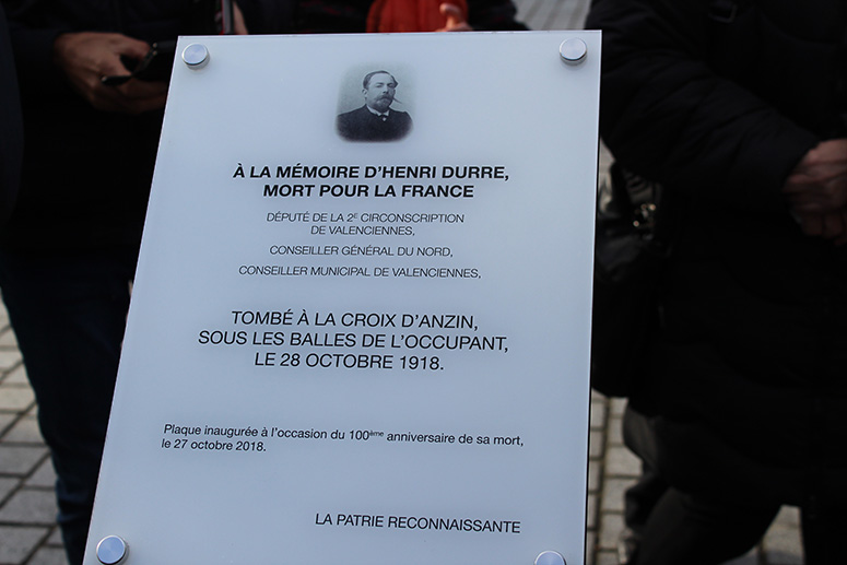 La guerre est quasi achevée fin octobre 1918, à deux semaines de l’armistice du 11 novembre, la ville de Valenciennes est libérée, et Henri Durre, député de la 2ème (aujourd’hui 20ème) circonscription vient habillé en civil à la rencontre des Valenciennois au niveau de la Croix d’Anzin. Malheureusement, une mitrailleuse dissimulée sous les décombres arrose la Croix d’Anzin et Henri Durre est « tué à l’aube de la paix. Ce sera le 17ème, et dernier député du Palais Bourbon (Assemblée nationale) tué durant la 1ère Guerre Mondiale », souligne Richard Ferrand.