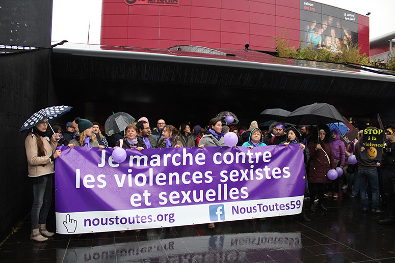 Le rassemblement était prévu à 14H sur le parvis du Phénix. La météo était pluvieuse, un ciel gris à fendre les coeurs, et portant la foule des « NousToutes » était là. Entre 180 et 200 personnes étaient au rendez-vous, une foule très mixte qui s’est attardée pour un bref discours devant le Phénix par Betty Rygielski. L’organisatrice de cette marche de « Nous Toutes 59 » claque quelques vérités : « Cette marche exprime notre ras-le-bol contre les violences sexuelles. C’est une réalité du quotidien. Une personne victime d’un viol à une espérance de vie réduite de 10 à 15 ans. Un enfant victime de violences va connaître des difficultés scolaires entre autres. Il faut oser parler, et faire de la prévention auprès de notre jeunesse dans les collèges et dans les lycées ».