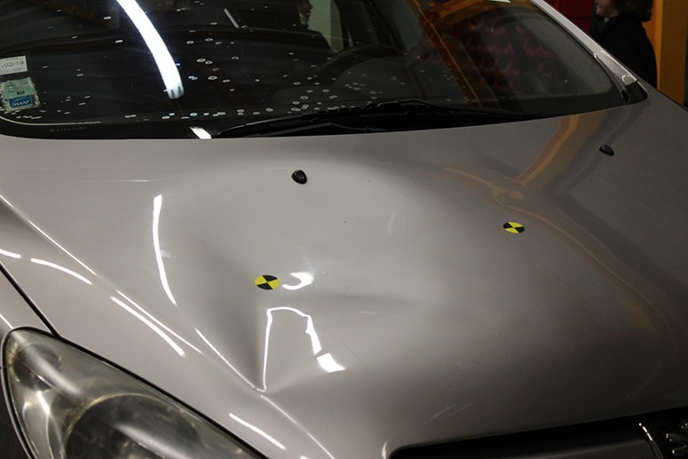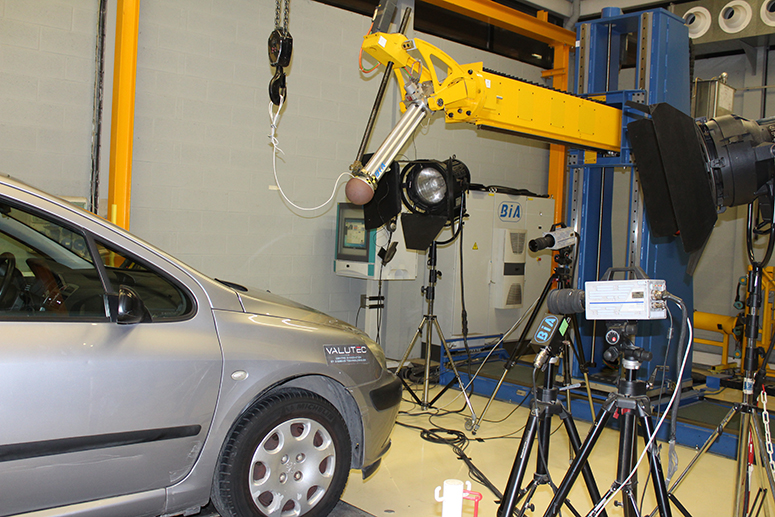 Autre expérience, un banc choc piéton permet de mesurer l’impact sur une personne percutée. Une boule de 20kg est envoyée à 40km/h sur une voiture, plusieurs essais sont possibles à 4 mètres et 7 mètres en terme de projection, choc tête, choc jambe, choc hanche etc. Par le biais de caméras, le lancer est filmé image par image. Puis, il est analysé par ordinateur. A l’oeil nu, il est quasi impossible de voir la boule impactée le capot de la voiture alors que nous sommes à 40km. De plus, le choc sur la voiture (dans le diaporama) tétanise le spectateur tant il est visible, impressionnant… avec une vitesse si réduite ! C’est une vidéo pour la sécurité routière en puissance (diaporama en fin d’article).