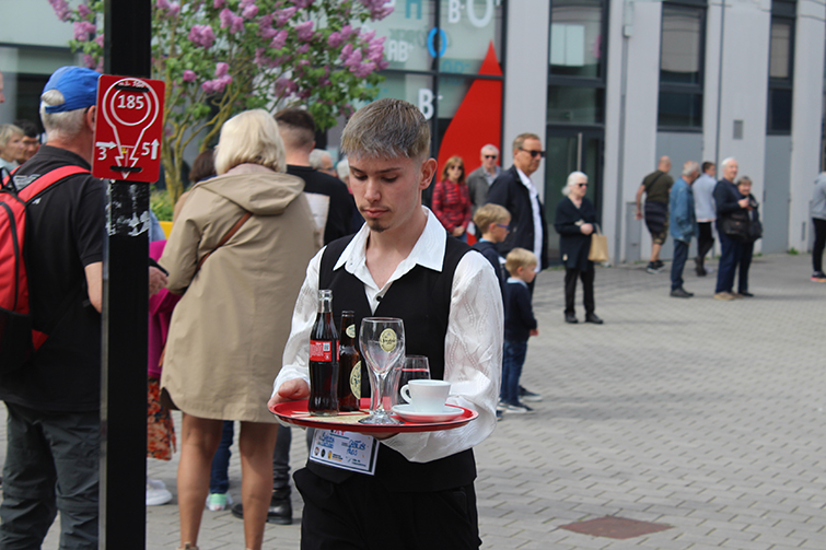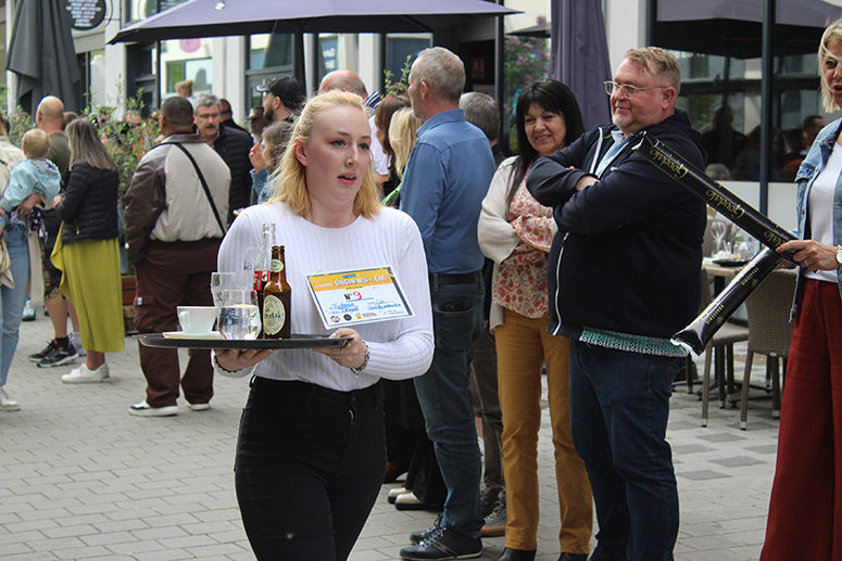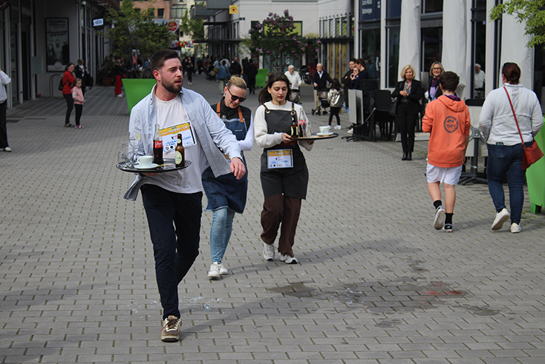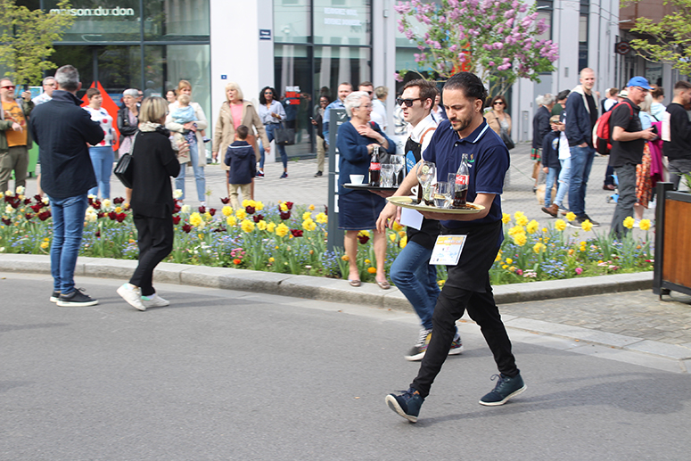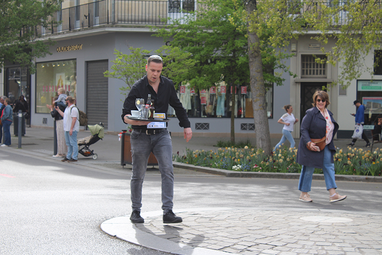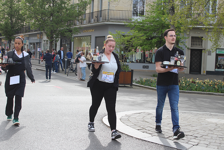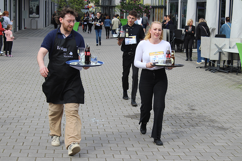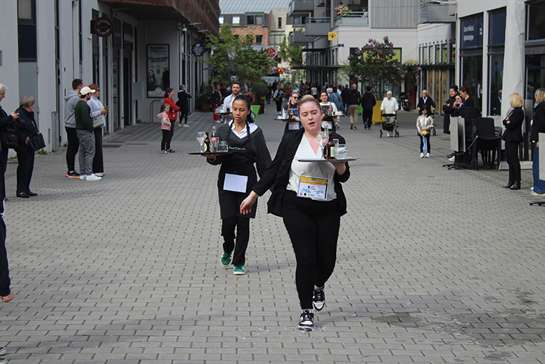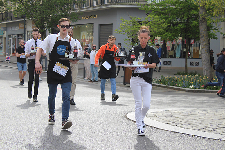 Avec 28 participants en provenance de 14 établissements ( Le Presbytère, le Cercle, les Caves du Monde, Le Bowling de l’Arsenal, le restaurant La Goudale, le restaurant Khao Phat Thaï, Columbus café, Boston Compagny, A quoi bar, La Gentilhommière, L’Espadrille, Le Bistrot d’en Face, Place ô Saveurs, et la Café de Paris), chaque compétiteur devait transporter sur son plateau 6 éléments, un verre de bière plein, un verre d’eau plein, un coca plein, une tasse vide, un verre à bière vide, et un coca vide. A l’arrivée, la sanction tombe avec « une pénalité d’une minute ajoutée au temps final du participant si un élément manque sur le plateau », précise Christine Mercier du Bowling de l’Arsenal.