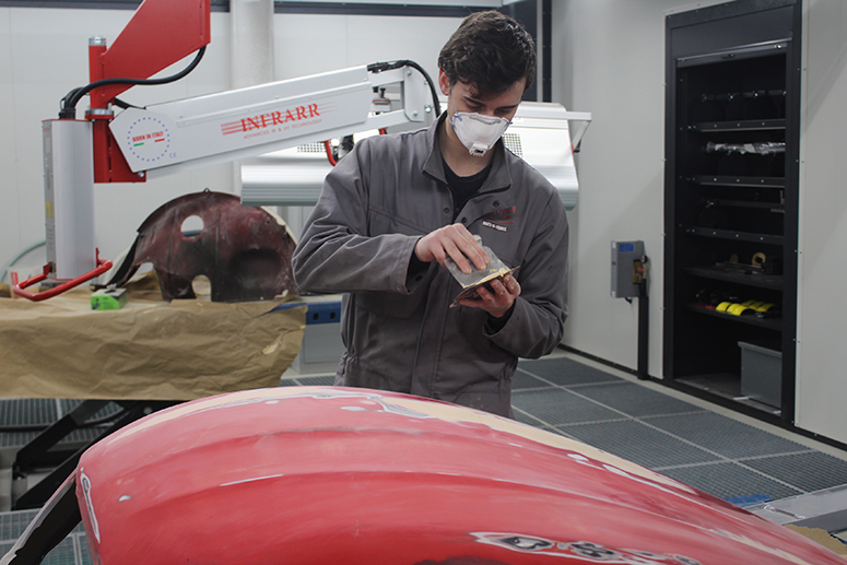 Plusieurs ateliers sont à la disposition des apprenants. Voyez plutôt, un atelier de carrosserie de haute technologie avec tous les outils indispensables sous la main, mais surtout une extraction par le sol des particules pour assurer la meilleure condition de travail des apprentis. Idem pour deux ateliers de peinture, où plus encore la nécessité de protéger les futurs professionnels est fondamentale, avec des systèmes de purification de l’air par le sol en mode vertical. Concrètement, les particules inhérentes à une opération de peinture automobile ne circulent jamais dans l’air, mais sont aspirés immédiatement vers le sol.