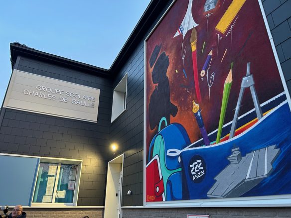 Durant son propos, la Directrice de l’école a tenu à signaler la coexistence d’un chantier, mais également « un projet pédagogique fort. » En effet, une fresque magnifique en mémoire au Général de Gaulle s’affiche en front à rue, elle est signée d’un graffeur professionnel. « J’habite Maresches. J’ai fait mon cycle artistique à l’école Saint-Luc de Tournai et je suis devenu professionnel depuis 3 ans environ. J’interviens sur les chantiers publics comme privés », explique cet artiste de 39 ans.