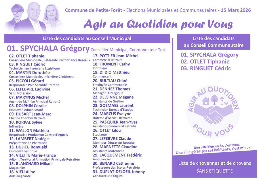 Sous la dénomination « Agir au quotidien pour vous à Petite-Forêt », la liste est bouclée (29 +2) avec une équipe renouvelée puisque Grégory Spychala ne part pas avec les couleurs du PCF, comme en 2020. « C’est une belle équipe, un collectif avec toutes les catégories socio-professionnelles et dans tous le quartiers. En fait, c’est aussi un regard nouveau et très enrichissant », déclare avec enthousiasme Grégory Spychala. « La commune de Petite-Forêt est très étendue et certains franc-foresiens sont très isolés avec un sentiment d’abandon ! Aujourd’hui, nous constatons qu’il n’y a pas assez d’écoute des administrés », ajoute Tiphanie Otlet.