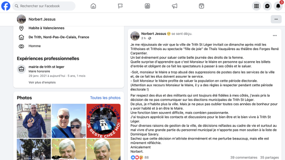 Dans un message sur son compte Facebook, l’ancien maire de Trith-St-léger explique les raisons de ce retrait qui pèsera dans cette dernière ligne droite assurément. Contrairement à la campagne de 2020, l’édile de Trith-st-Léger ne bénéficiera pas de l’aura incontestée de Norbert Jessus à huit jours du 1er tour, un fait politique majeur à gauche ! Retrouvez tous les commentaires sur le compte de Norbert Jessus : https://www.facebook.com/norbert.jessus