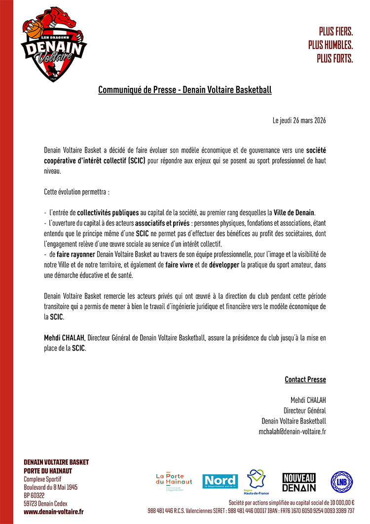 Au détour d’une saison sportive très robuste, le club professionnel de basket « Denain Voltaire » va changer de structure juridique dans les prochaines semaines. Aujourd’hui sous la forme d’une SAS, il passera sous un format juridique assez particulier. En effet, une SCIC (Société Coopérative d’Intérêt Collectif) a été choisie afin de permettre l’entrée au capital d’institutions publiques locales et/ou territoriales en sus d’autres acteurs économiques privés. Ce modèle juridique n’est pas spécifique aux clubs sportifs, mais la Ministre des Sports (2020/2022), avait proposé cette alternative dans un momentum (Covid) où le sponsoring était en berne, un peu comme actuellement où la géopolitique internationale et ses répercussions nationales peu rassurantes pour le monde économique constituent des freins existentiels (crédits photos Denain Voltaire Basket).