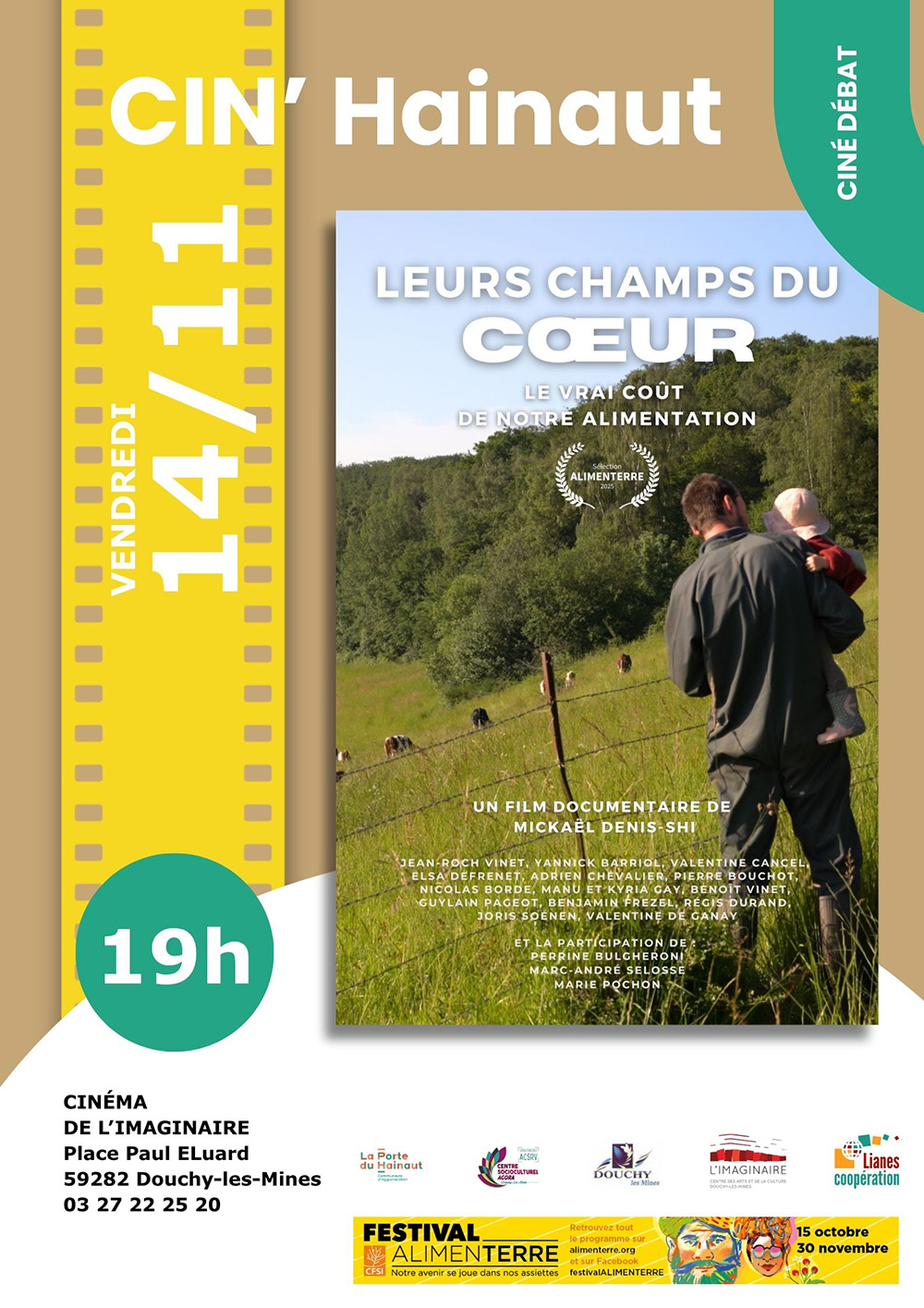 Comment produire une alimentation de qualité, juste pour les producteurs et accessible à toutes et tous ? Dans le cadre du festival ALIMENTERRE, l’ACSRV vous invite à assister au Ciné-débat autour du film documentaire « Leurs champs du coeur » de Mickaël Denis-Shi, le vendredi 14 Novembre 2025 à partir de 19h00 au cinéma L’Imaginaire de Douchy-les-Mines.