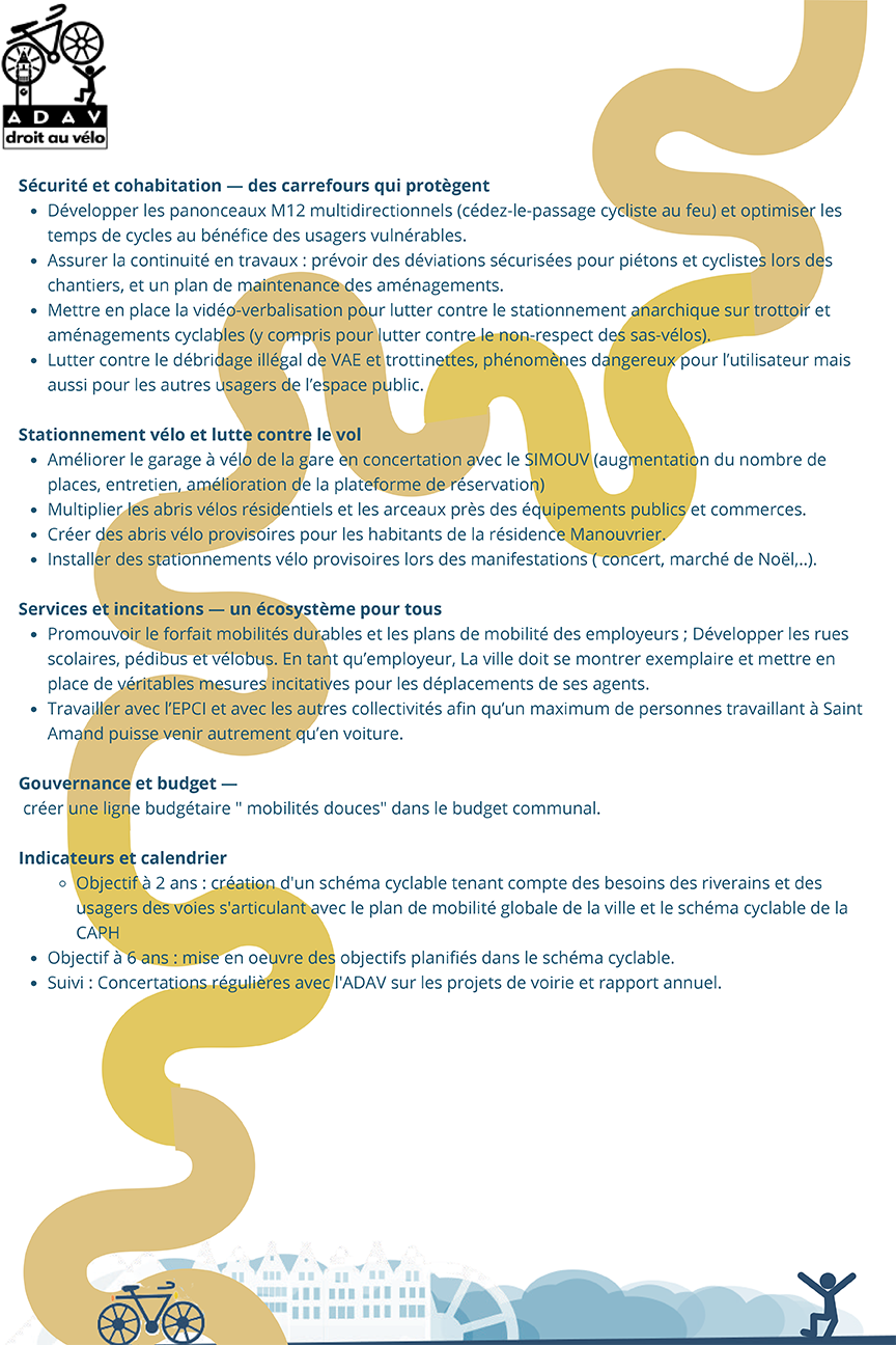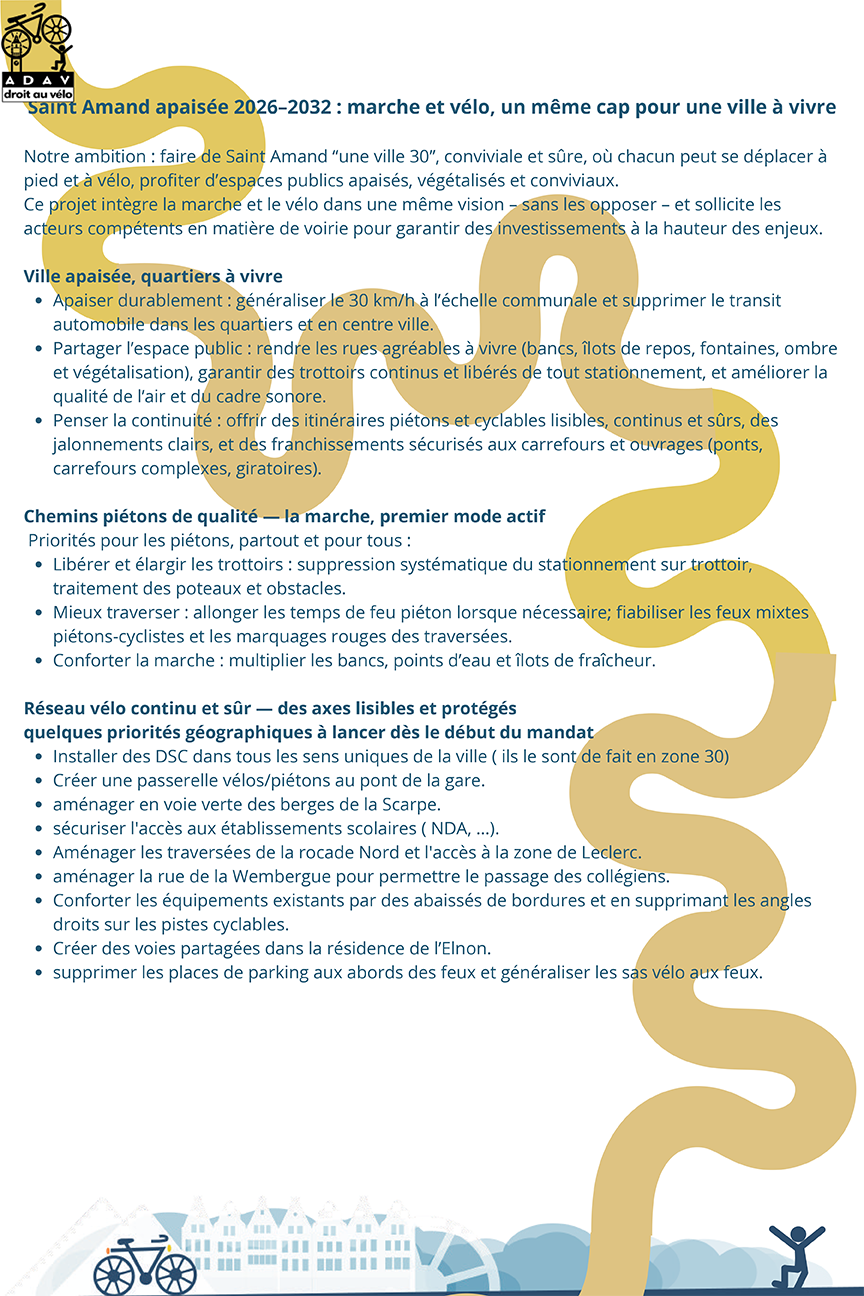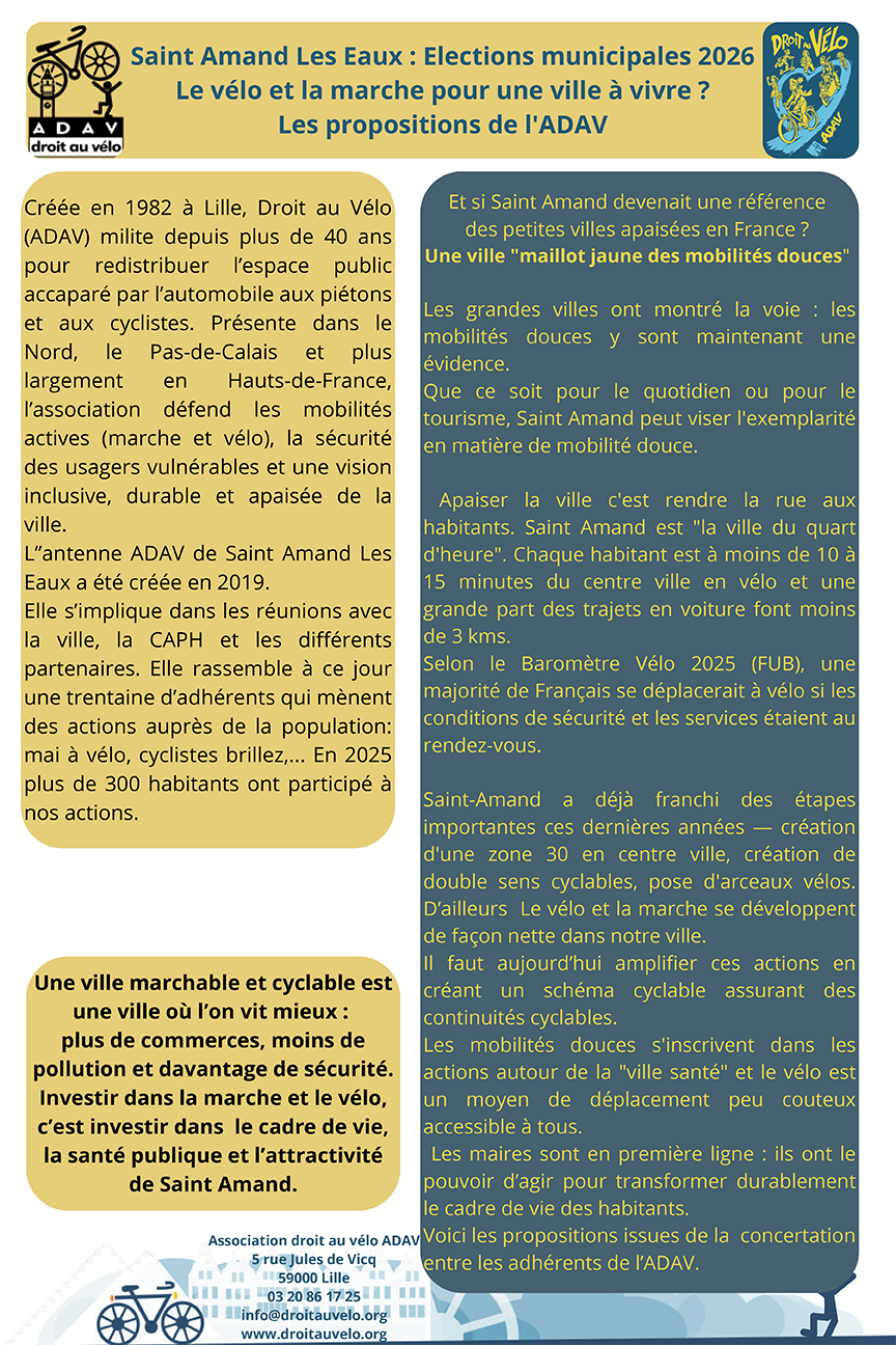 L’antenne amandinoise de l’association « Droit au Vélo » a proposé aux 3 candidats en lice pour ces élections municipales 2026, les 15 et 22 mars prochain, une série d’aménagements ou de modifications en faveur de la mobilité.